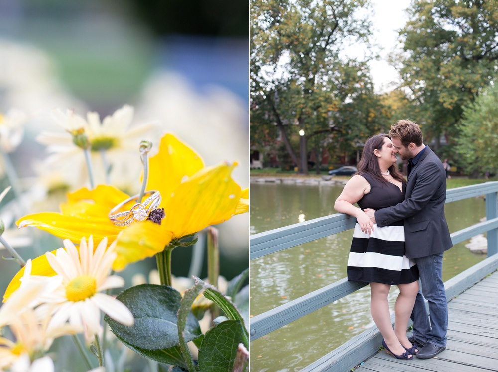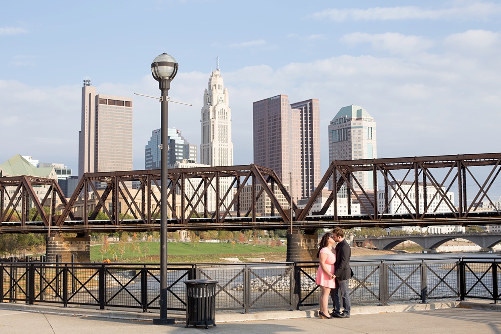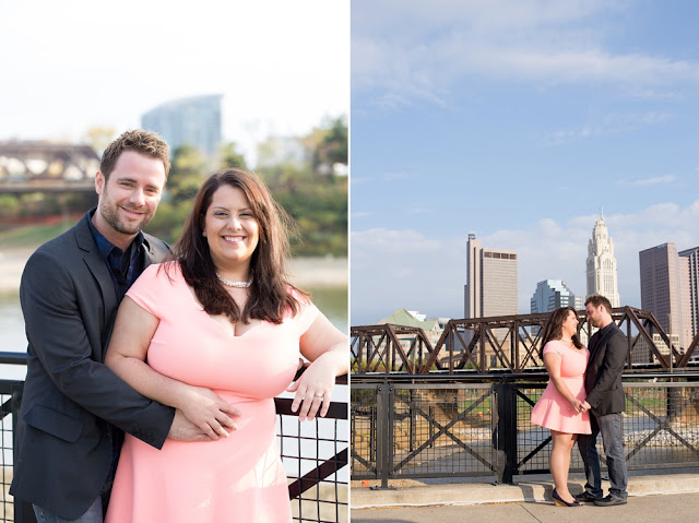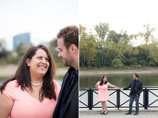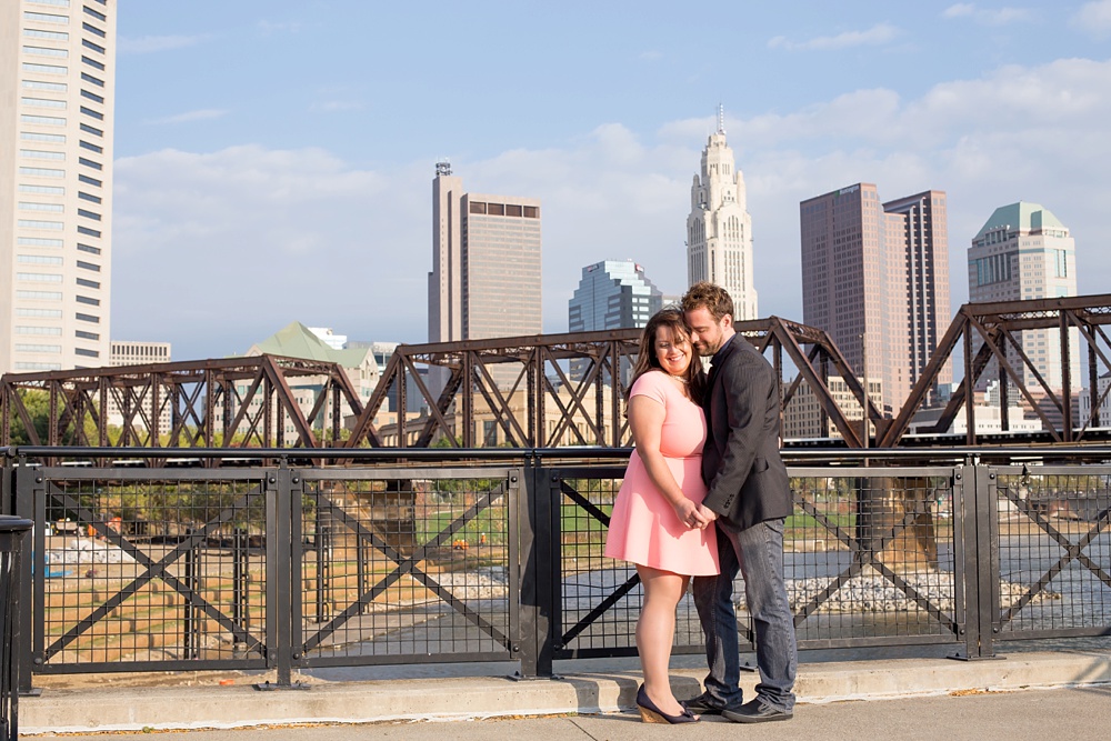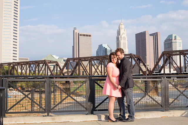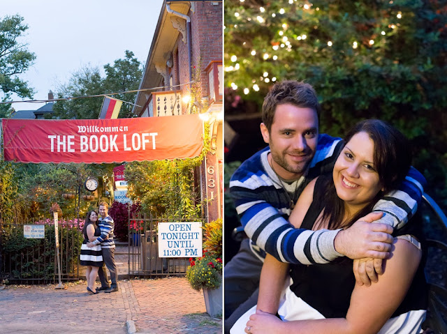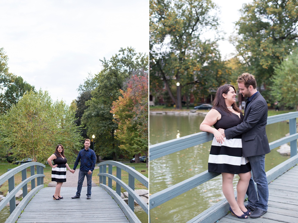 As soon as I stepped out of my car and saw Jessica’s enthusiastic wave from a few parking spaces away, I knew that this engagement session was going to be a fun one! Jessica and Joe currently live in New York and we had made time for their engagement session on their visit back to Columbus for a few days. I was so excited that we had such beautiful weather! It was the perfect summery/fall evening in October, and we just chatted along like old friends as we moved from spot to spot. Their love is just infectious and precious to witness- all Joe has to do is look at Jessica and she melts into a pile of giggles. Every facial expression you see in their photos is so genuine and that’s why I LOVE them! I hope you enjoy looking through Jessica & Joe’s engagement session that took us from North Bank to Schiller Park to the Book Loft. What a magical evening! I can’t WAIT for their April 2016 wedding. It’s going to be amazing!!! 🙂