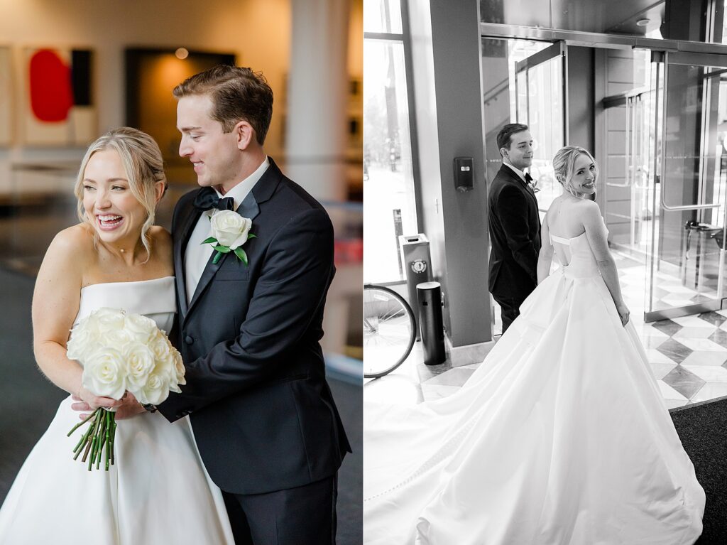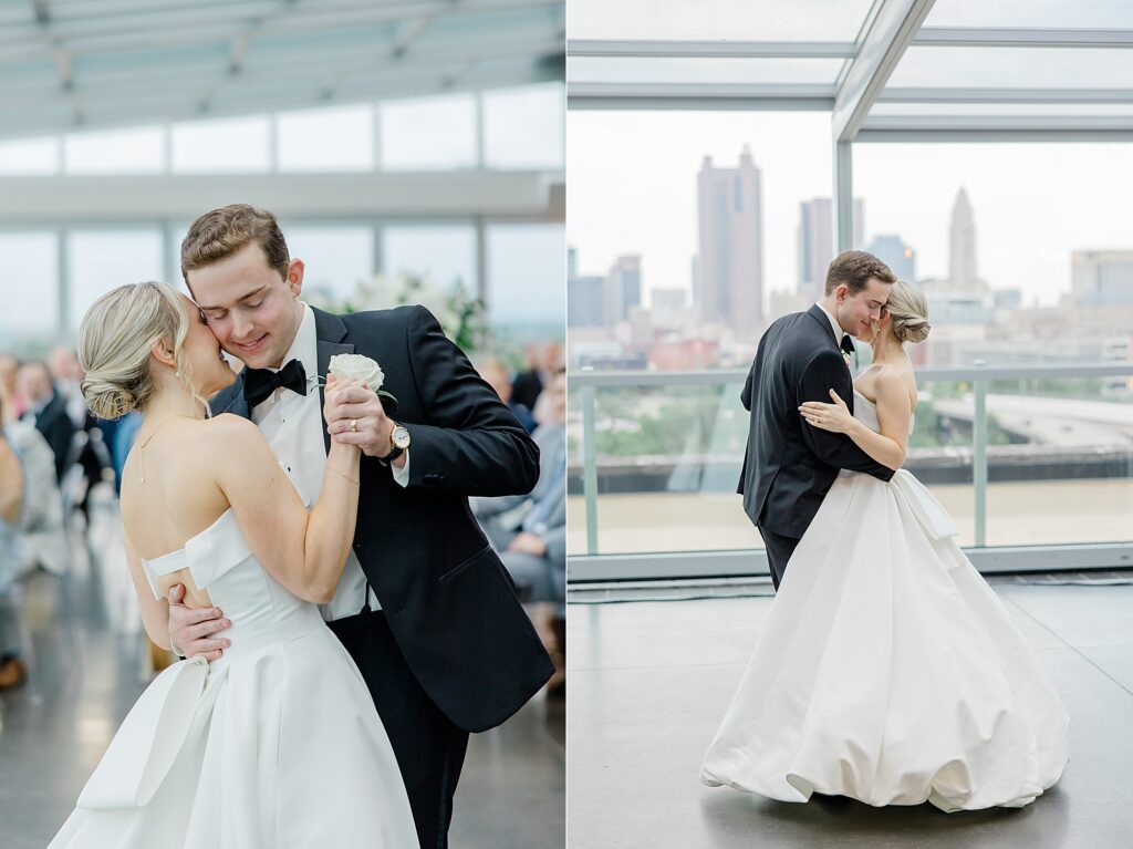 From the top floor of the Joseph in downtown Columbus, we watched through the sprawling windows as dark storm clouds rolled across the sky, getting closer and closer. But inside the bridal suite, excitement and anticipation hung in the air. Hair and makeup applied to perfection, champagne poured and shared, smiles absolutely everywhere. With the help of her mom, Morgan put on her show-stopping Rita Vinieris gown and we waited for the rain to stop.