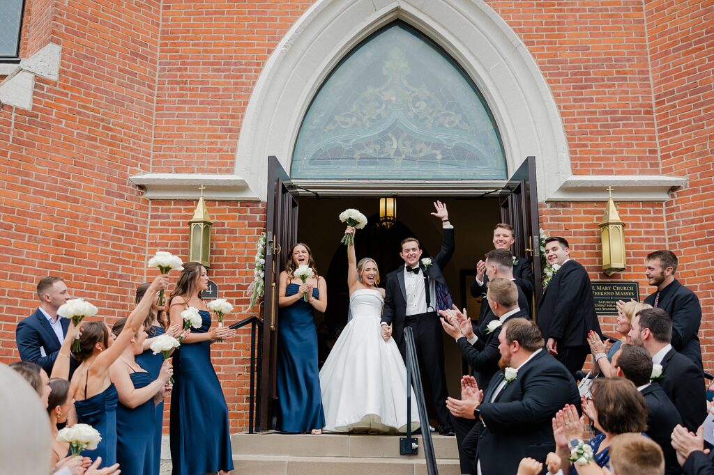 A first look with private vows in the private upstairs lobby of the Joseph. A quick stop at North 4th Corridor for bride & groom portraits on the sleek bar at Revery. And then a lightning round (pun intended) of wedding party & couples portraits on the steps of the Ohio Statehouse before the heavens opened up again. It was raining when we arrived at the church for their wedding, but no problem. We were ready, and no amount of rain could dampen their spirits.