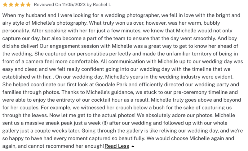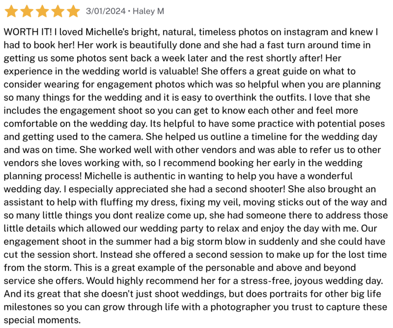 We'll do a 90 minute engagement session where you and your fiancé will learn all my posing secrets so you can walk into your wedding day portraits with confidence. You'll get 100+ images delivered in an online gallery, and I'll even help you choose the perfect location & outfits!